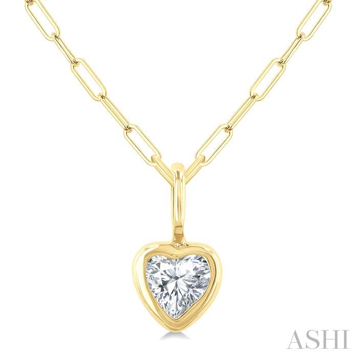 A symbol of love and affection, this lovely diamond heart fashion pendant serves as a heartfelt expression of love and devotion, symbolizing the deep bond shared between two souls. Whether worn as a romantic gesture or as a symbol of self-love, the pendant is sure to capture hearts and evoke emotions. It features an eye-catching heart-shaped diamond, bezel set within a pendant of the same shape, radiating with beauty and romance. Suspended delicately from a loop holder, the pendant is paired with an 18-inch 1.05MM Paperclip chain, both styled in a polished finish 14 karat yellow gold. Total diamond weight is 1/5 Ctw.